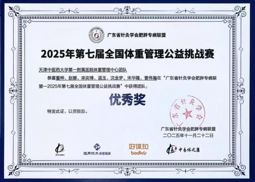 此次获奖不仅彰显了团队在体重管理领域的深厚实力,也为中医在体重管理方面的应用提供了成功范例。未来,体重管理中心将继续发挥中医药特色优势,进一步优化“防-治-管”一体化服务模式,为推动我国体重管理事业高质量发展、助力“健康中国”建设贡献更多中医力量。(治未病管理中心供稿)