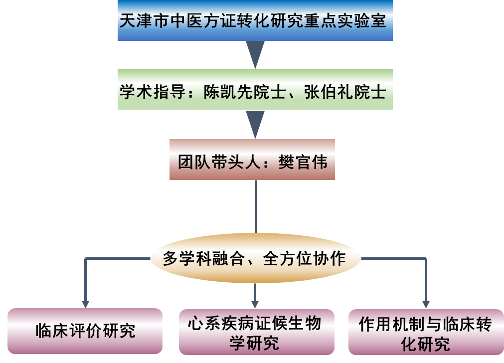 实验室依托教育部中医内科学重点学科、冠心病国家中医临床研究基地、天津市中医内科临床医学研究中心等核心研究平台,严格遵循中医药传统理论体系与自身发展规律,有机融合现代转化医学的研究理念与技术方法,坚持继承与创新并重,突出中医药特色优势。实验室围绕冠心病、心力衰竭、高血压病等重点心血管病种,聚焦“病-证-方”核心逻辑,开展多层次、系统性研究,凝练形成三大稳定且具特色的研究方向:中医药防治心血管疾病临床评价研究、病证结合模式下的心系疾病证候生物学研究、临床有效方剂及经典名方的作用机制与临床转化研究。目前,实验室在上述研究领域已取得一系列突破性成果,整体研究水平居于全国领先地位,紧密对接中医临床发展的科技需求,深入探索方证转化的生物学基础与科学内涵,为中医药防治心血管疾病的临床转化提供有力支撑。